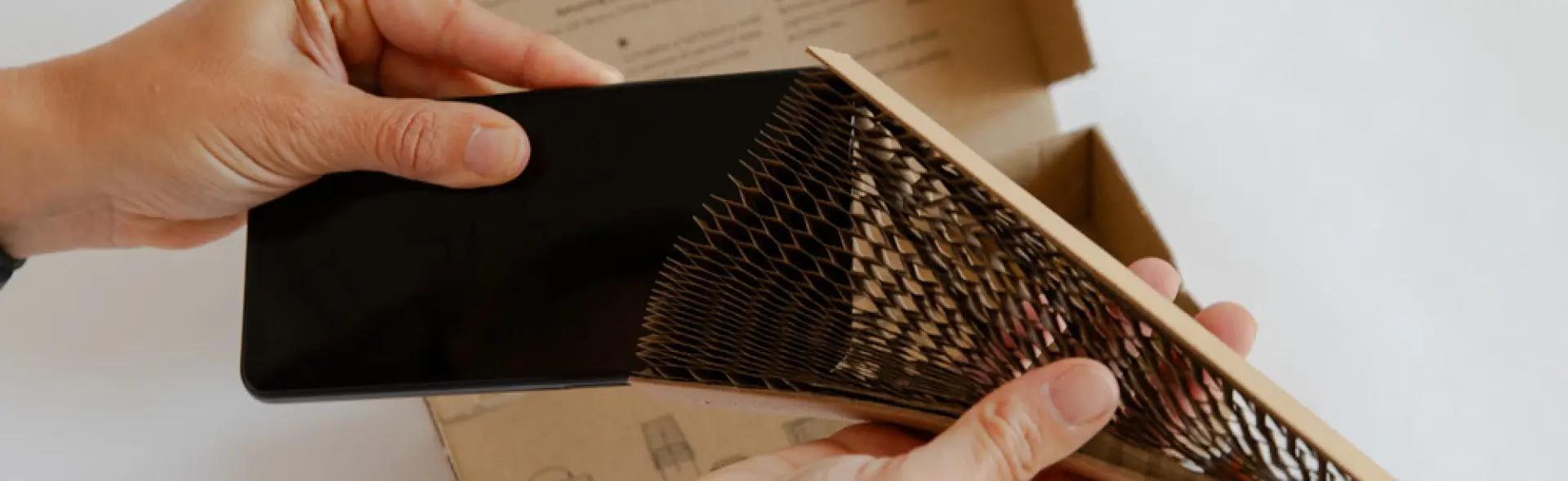 Flexi-Hex’s phone packaging is compact and protective. The flexible structure fits various phone models securely, making it perfect for consumer returns or internal device redistribution. Made from recyclable paper, it offers a sustainable alternative to traditional plastic and foam, helping brands meet growing demand for eco-conscious packaging.